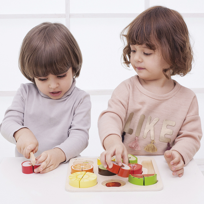 - 野菜と果物の断面のパズルです。パズルは2ピースが面ファスナーでくっつき、ナイフでサクッと切れます。ボード上で型はめができ、またピースを外すとその野菜・果物の絵が描かれています。形は変わっても、同じ野菜・果物であること、その野菜・果物の名称をパズルを通して理解します。