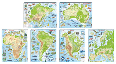 ■セット内容: アジア(63ピース) オーストラリア(65ピース) アフリカ(63ピース) 南アメリカ(65ピース) 北アメリカ(66ピース) ヨーロッパ(87ピース)各1