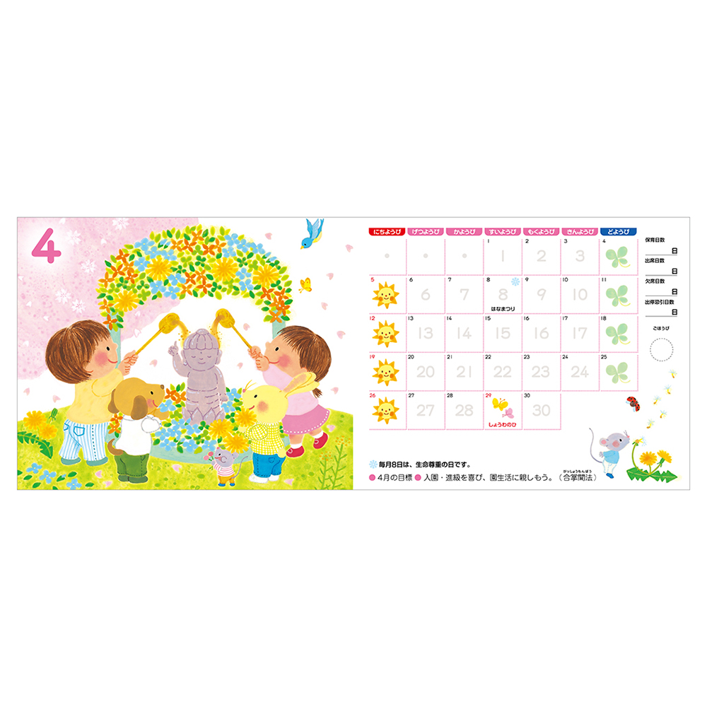 - ■セット内容: 仏教行事と季節行事の両方で構成しています。 4月:花まつり、5月:ピクニック、6月:雨上がり、7月:海辺の遊び、8月:盆おどり、9月:秋の花つみ、10月:運動会、11月:工作、12月:成道会、1月:たこあげ、2月:涅槃会、3月:卒園式
