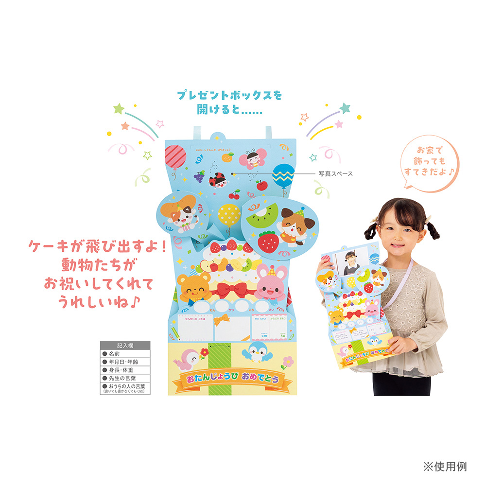 プレゼントボックスを開けると、ケーキが飛び出すよ!動物たちがお祝いしてくれてうれしいね♪