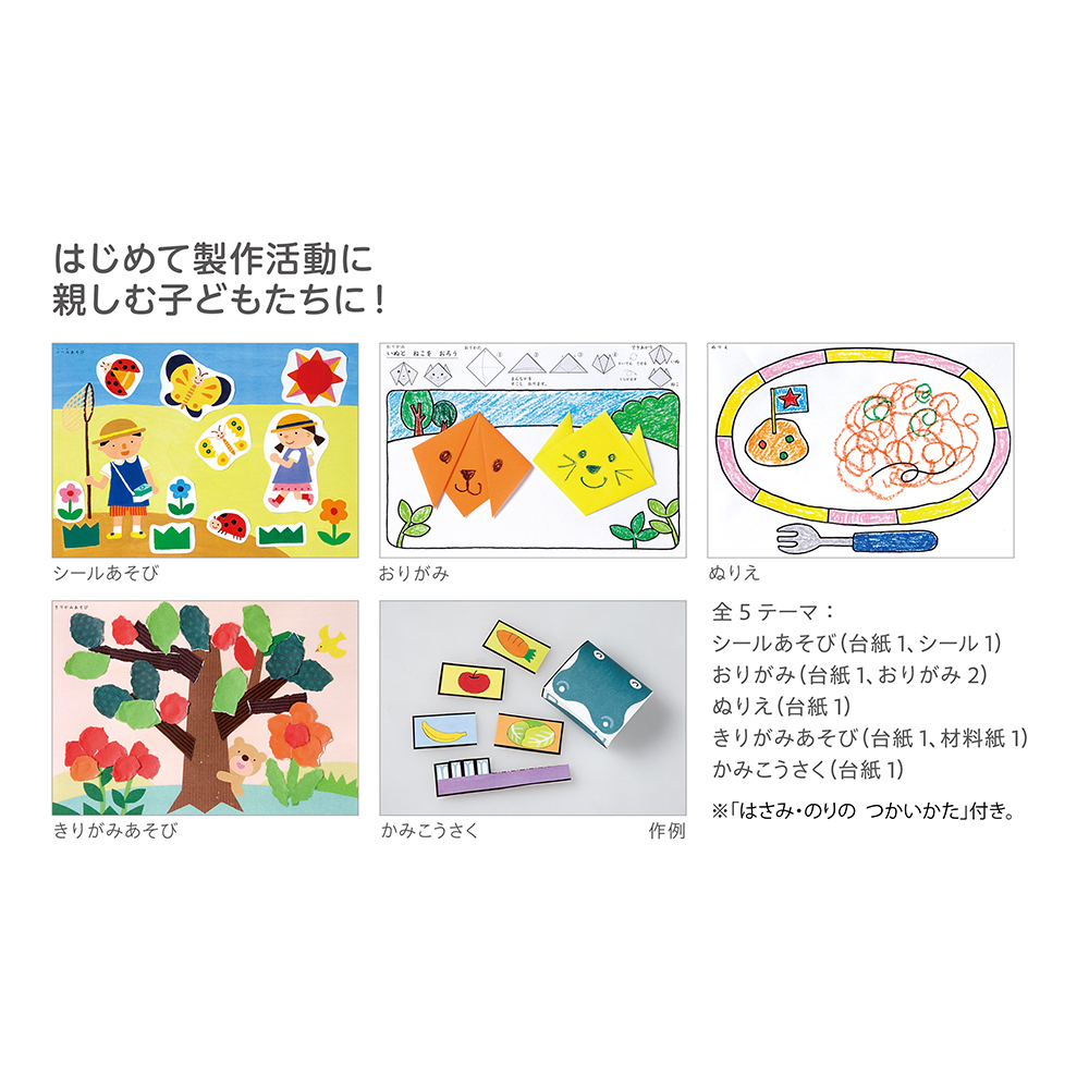 ■セット内容: 1. シールあそび(台紙1、シール1) 2. おりがみ(台紙1、おりがみ2) 3. ぬりえ(台紙1) 4. きりがみあそび(台紙1、材料紙1) 5. かみこうさく(台紙1)