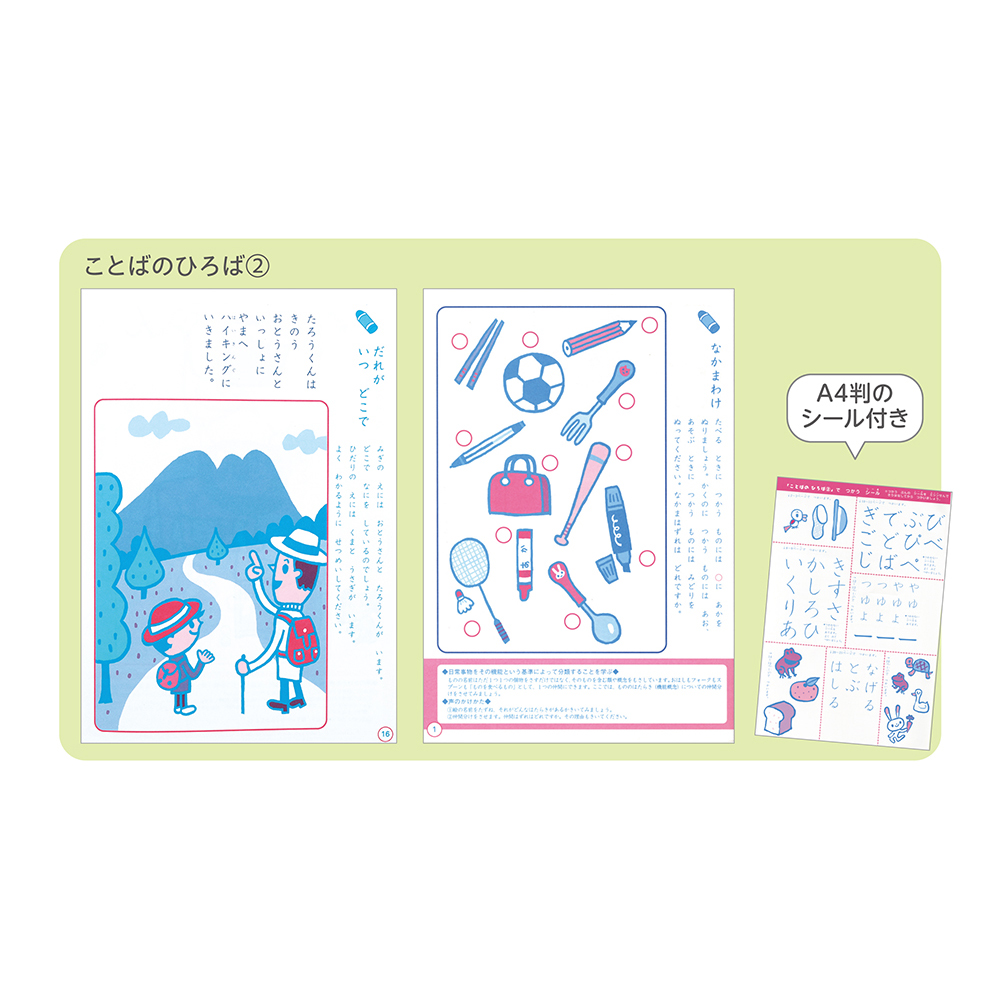 - 子どものことばに着目し、理解と関心を深め、ことばのはたらきをさらに伸ばすよう工夫されています。 なぞなぞをといたり、パズルを作り上げたりするような、「考えるおもしろさ」を経験しながら、じっくり取り組んでいく内容です。