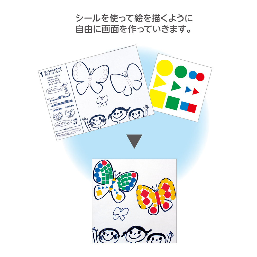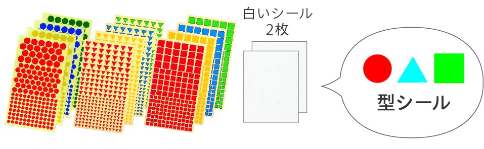 ■セット内容: 画学紙10枚1色刷 丸・三角・四角シール12枚 (3種類:赤・青・黄・緑各1枚) 白いシール2枚