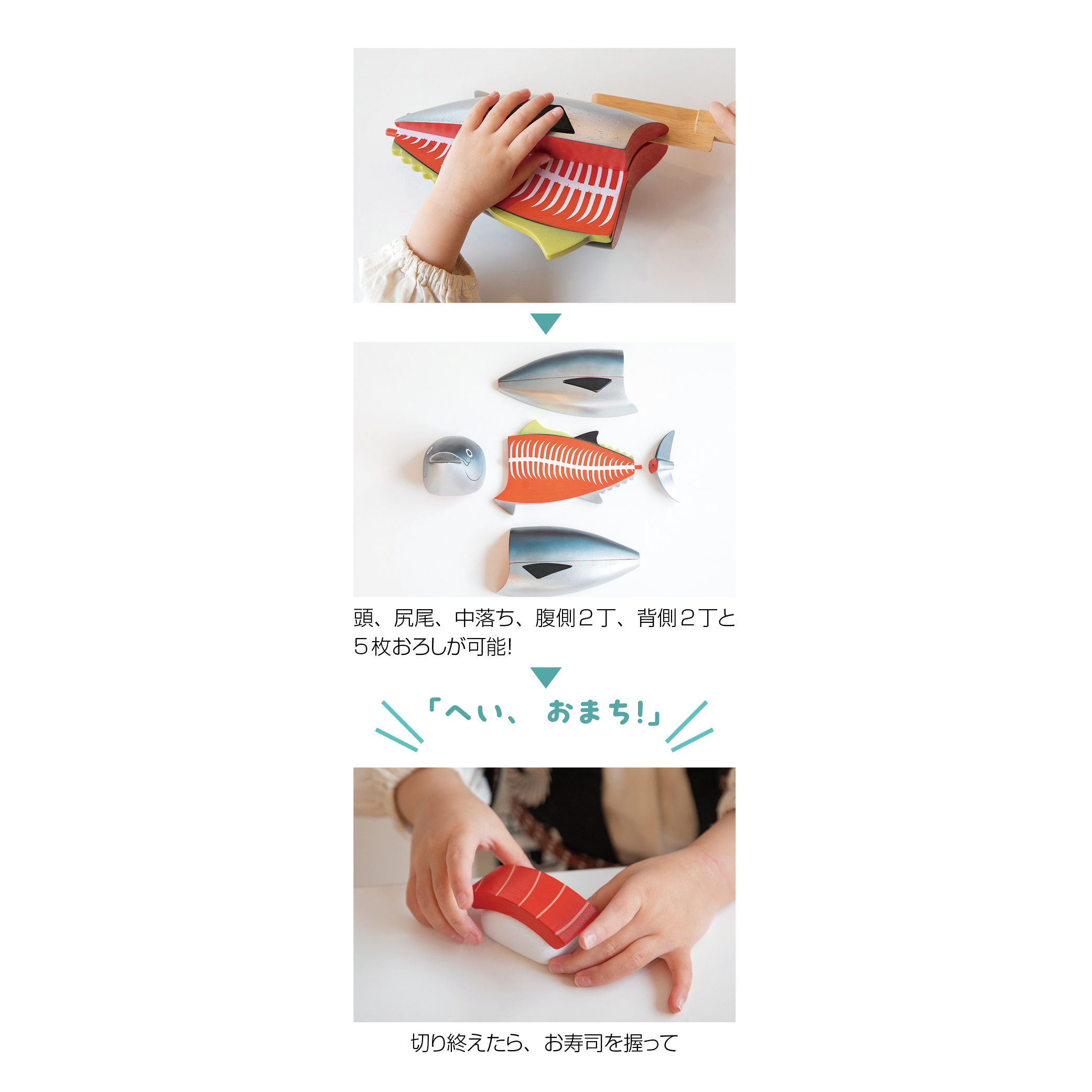 本物のようなマグロをつかったままごとで、食材となる生き物のなりたちを学び、自然の恵みに感謝するこころを養います。