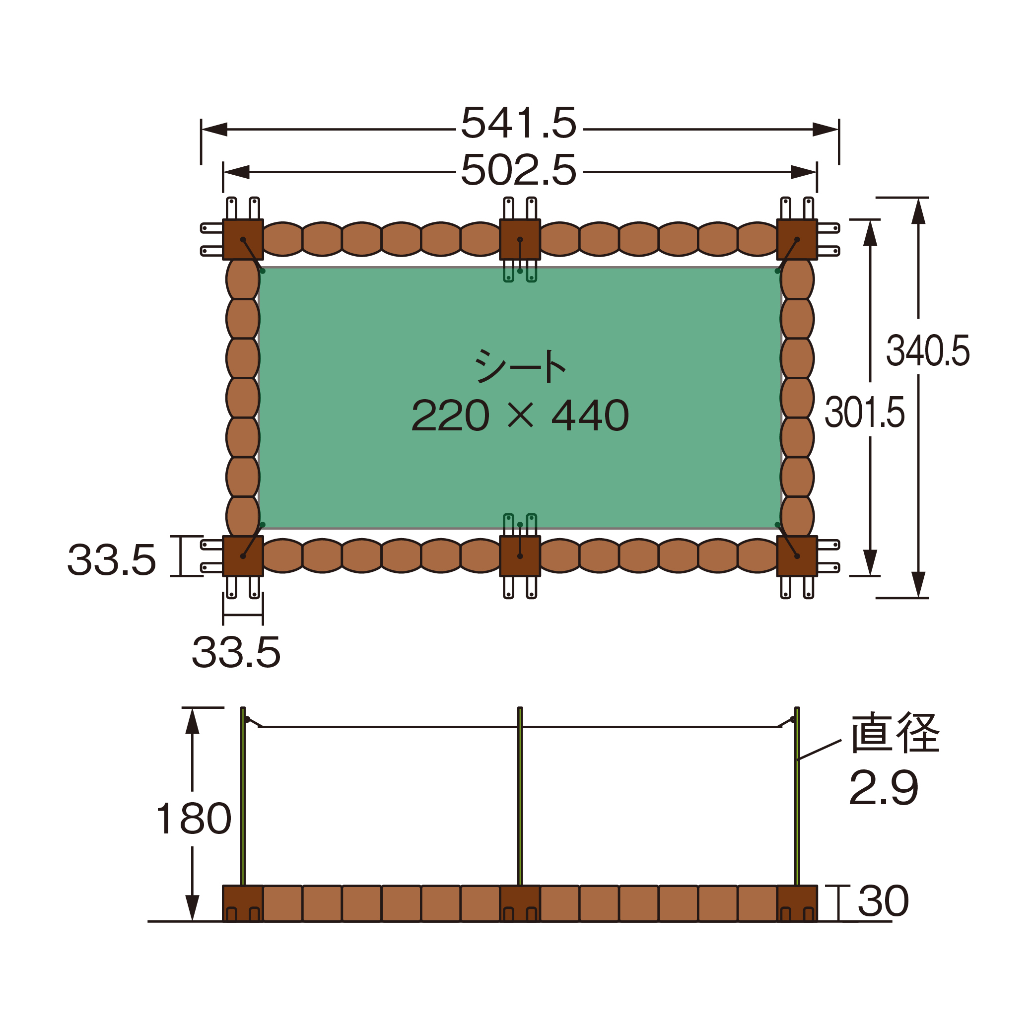 - ■セット内容: シート1 支柱6 連結土台ユニット6(コーナー4、直線2) 打ち込みアンカー24