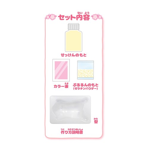 - ■セット内容: せっけんのもと カラー液 ぷるるんのもと 型 作り方説明書