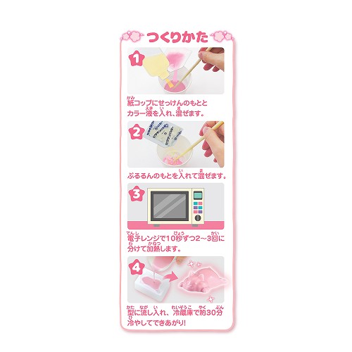 ■材質: せっけんのもと:水 カリ石けん素地 コカミドDEA コカミドプロピルベタイン 香料 DPG サトザクラ花エキス グリセリン 塩化Na クエン酸 BG EDTA-4Na カラー液:グリセリン 水 顔料 ぷるるんのもと:ゼラチン 型:PP 説明書:紙