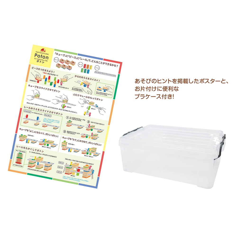 あそびのヒントを掲載したポスターと、お片付けに便利なプラケース付き!