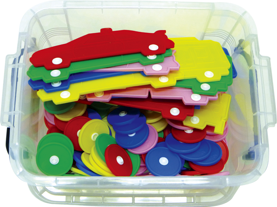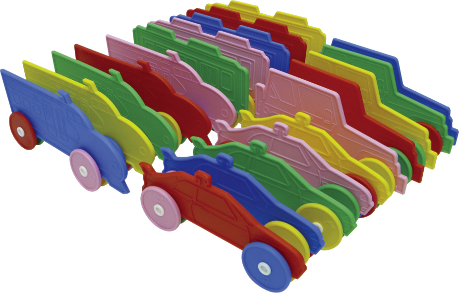 指先の訓練ができ、創造力を養います。曲げられるやわらかいブロックです。乗り物プレートにタイヤを付けて走らせましょう。ホックブロックと組み合わせて遊べます。