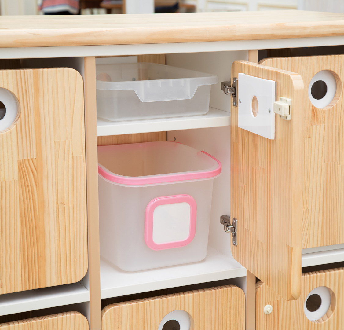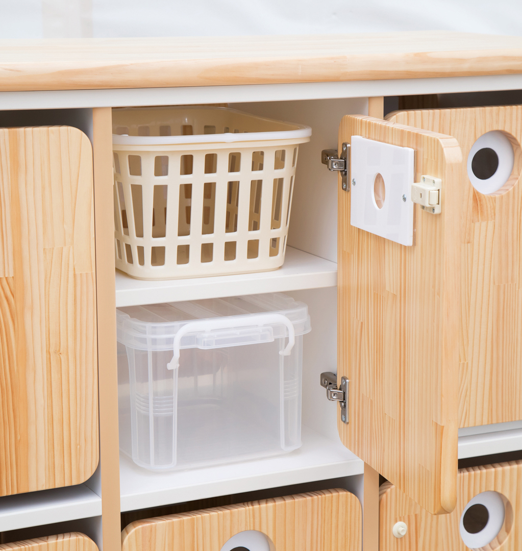 両側から物の出し入れができる、扉付きのロッカーです。6人分のおむつや衣類のストック収納に便利です。