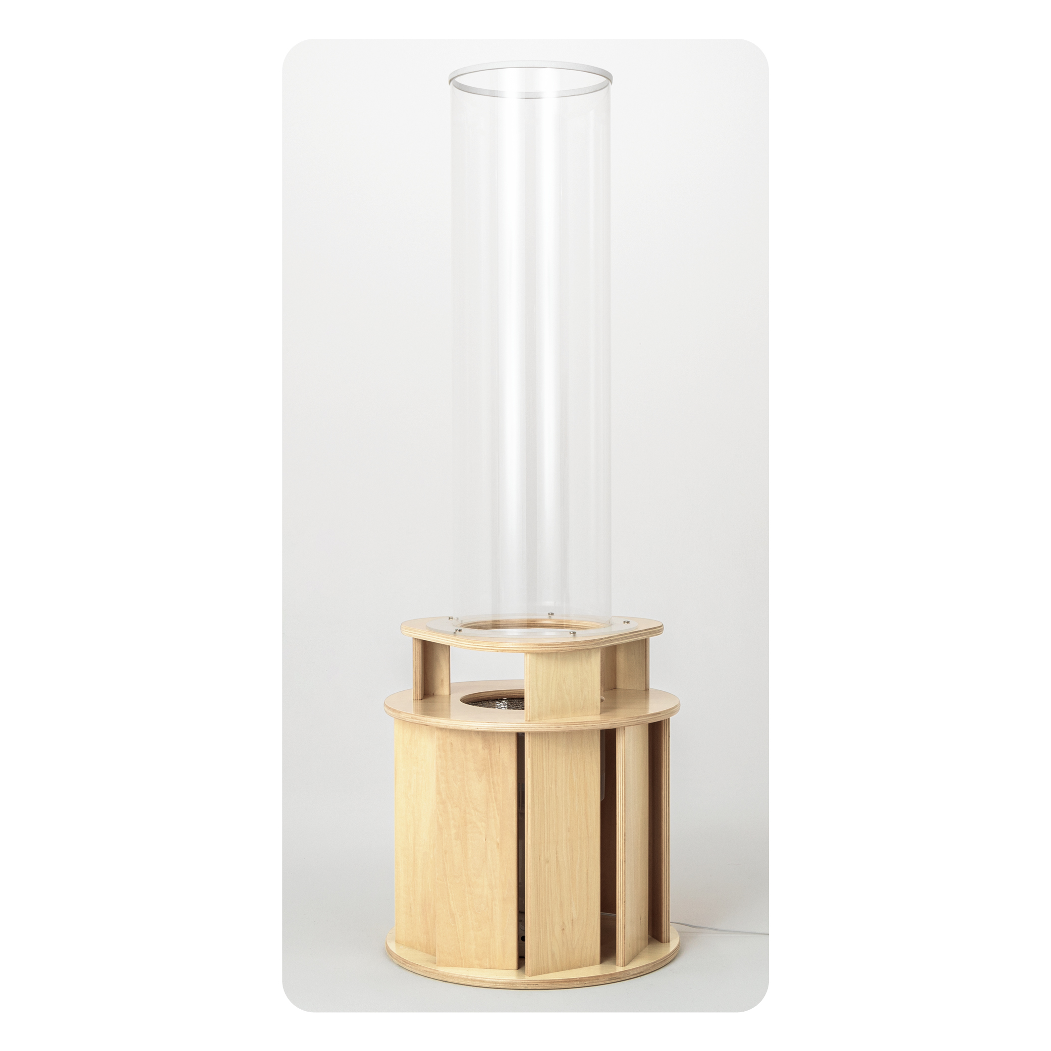 透明な筒の中を空気が上昇し、下のすき間から物を差し入れると、重さや大きさ、その差し入れ方によってさまざまな動きが現れます。