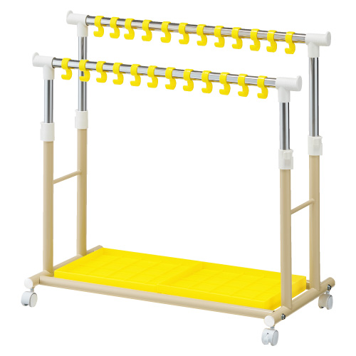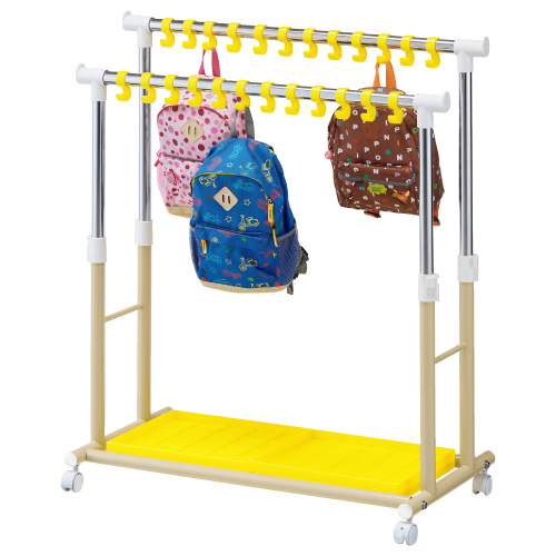 S字フックは子どもが両手で物をかける際にブラブラ動かずかけやすくなるように、ポールにカチッとはまる仕様です。S字フックは幅広いので名札シールや円形シールを貼ることができます。フックの位置は自由に変えられます。