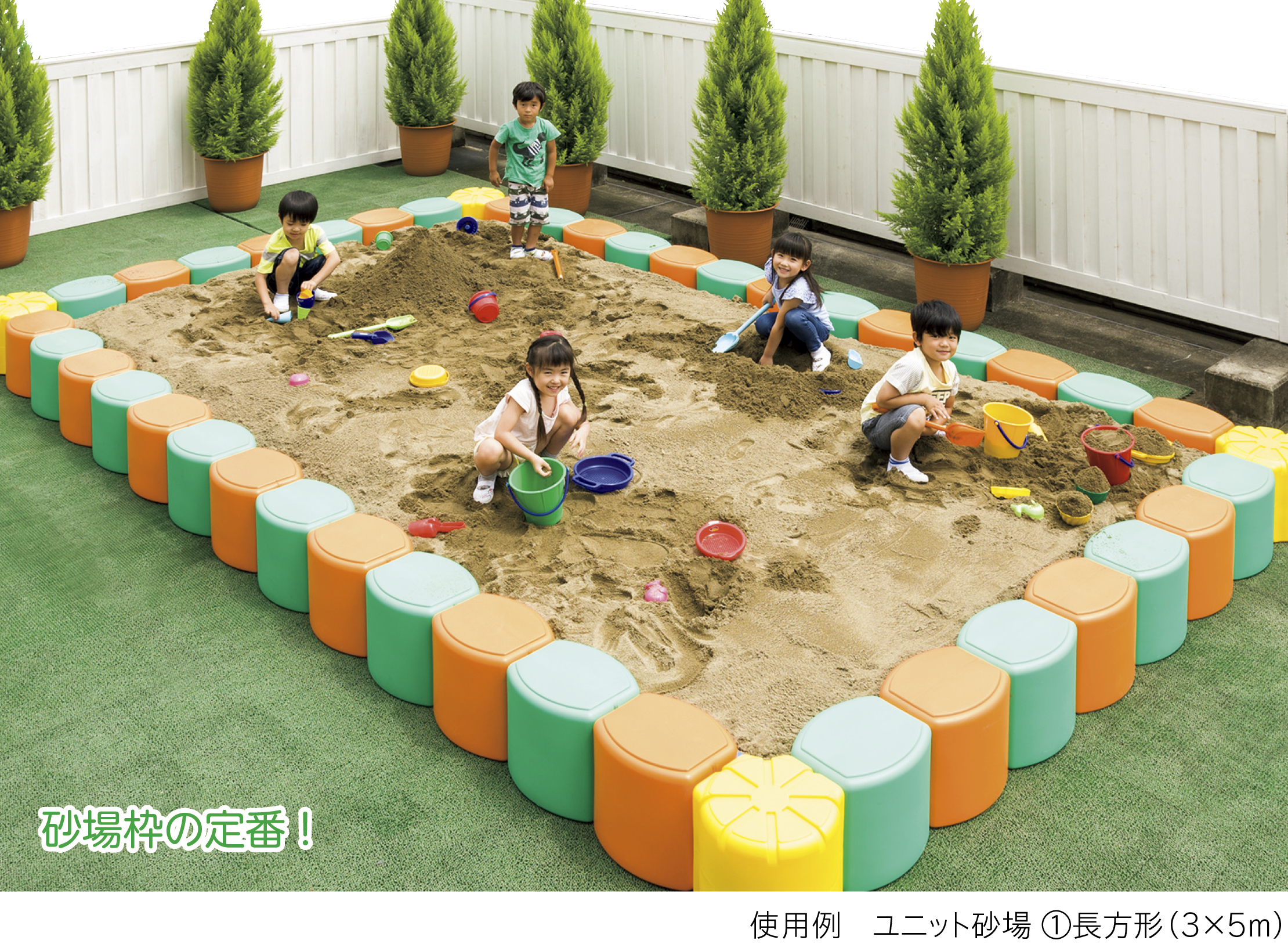 カラフルで、場所とスペースを選ばないユニット式です。腰かけベンチ、砂遊びテーブルとしても使えます。