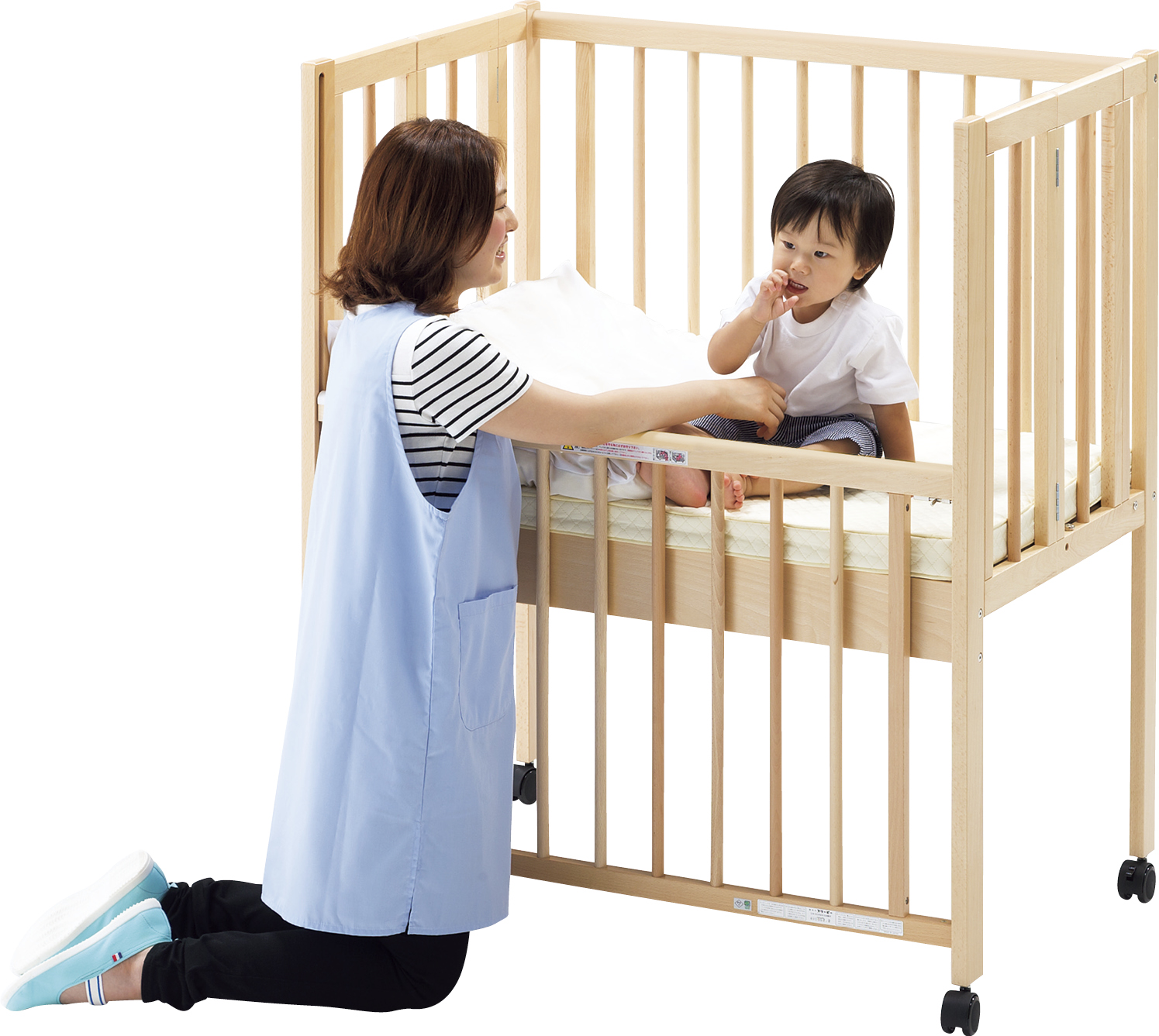 枠は上下スライド式で開閉でき、省スペースで保管ができます。マットまでの高さが65.5cmと高く、保育者の腰への負担が少なく、マットを入れたまま折りたたんで収納できます。