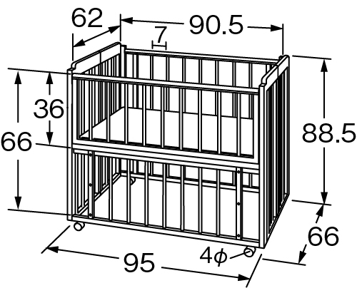 コンパクトに折りたたむことができ、移動が楽なキャスター付きです。手すりから床面の深さを2段階(36・66cm)に調節できます。
