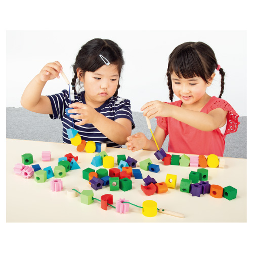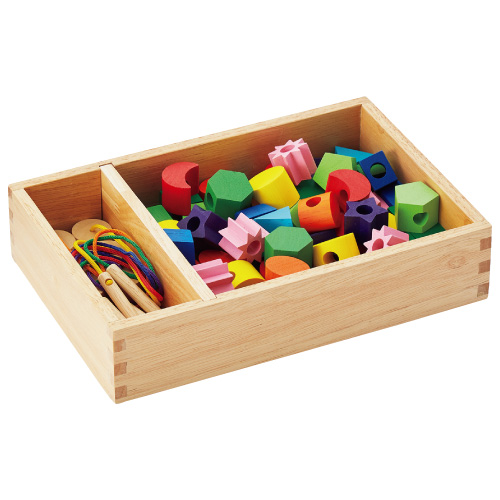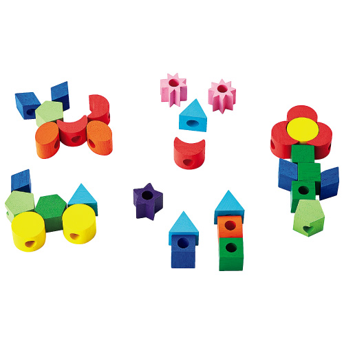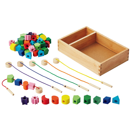 - いろいろな形の木製ピースにひもを通して楽しく遊べます。