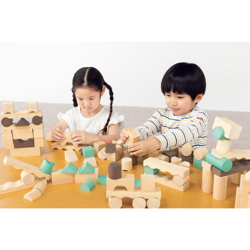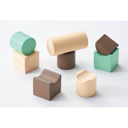 国産材を使用した玩具の需要増加から、「国産材のひのき」の積み木を製品化しました。R溝付きピースは、通常の積木ではできないような形が作れるため、造形の幅が広がります。