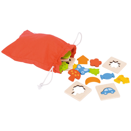 ③かんじて!かたちあてゲーム(2~4人用):枠フレームにマッチする形ピースを袋の中から感触だけで探し当てるゲームです。