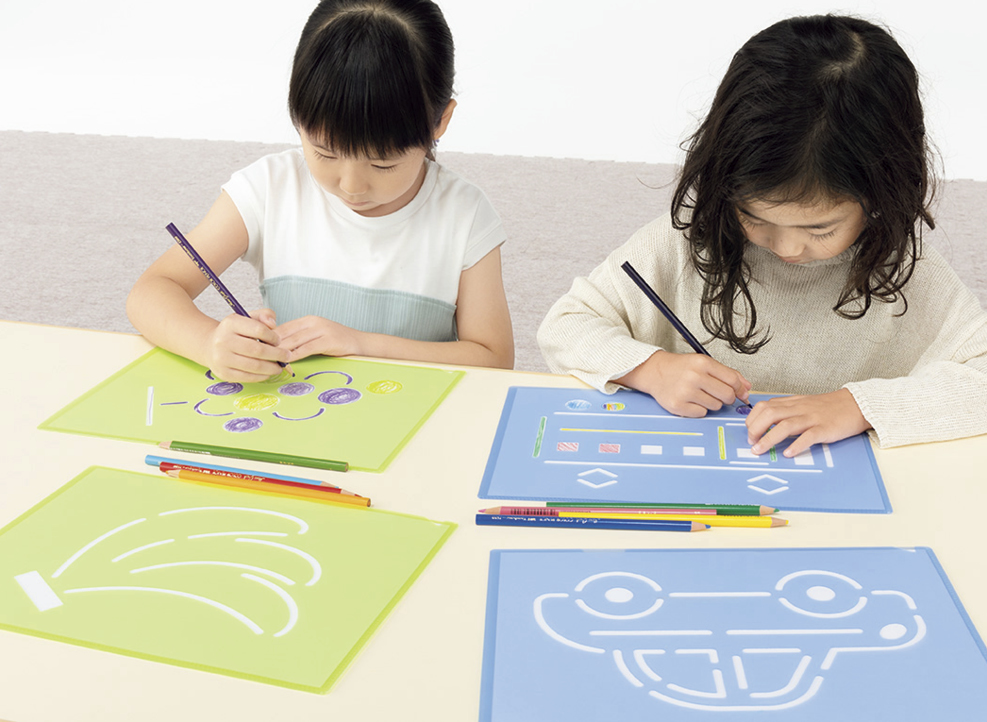 テンプレートにA4サイズの紙をはさみ、ペンでなぞります。絵が苦手な子でも描くことができるので「できた!」という達成感を感じることができます。直線やカーブを描く動きは、手首をなめらかに動かす経験ができます。