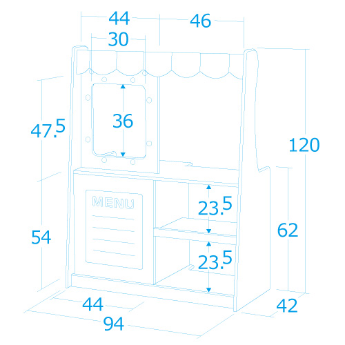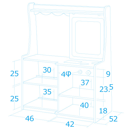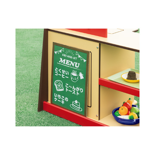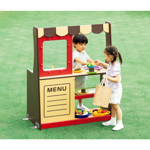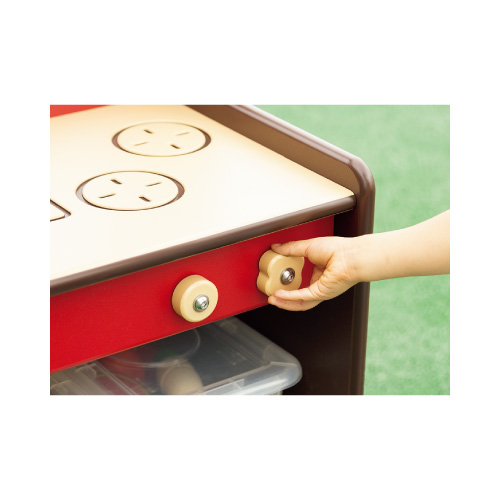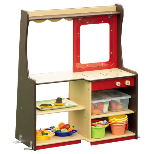 カウンター側の陳列棚にはごっこ遊びの「売り物」を並べ、コンロ側の収納棚には玩具や砂場道具が収納できます。