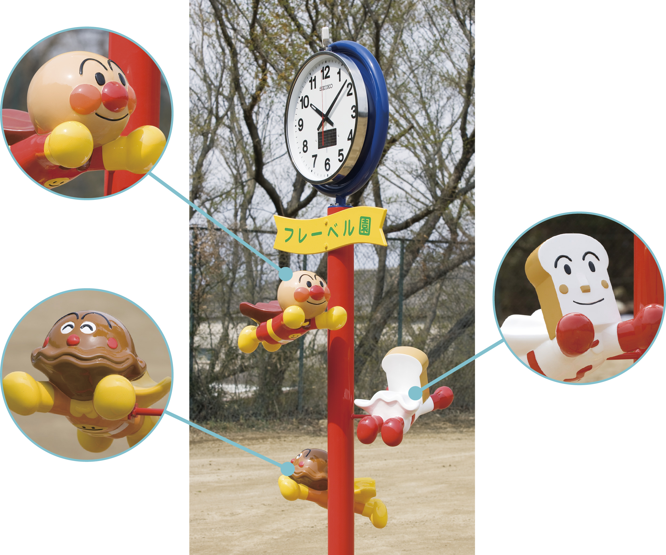 かわいいアンパンマンたちの人形が付いたモニュメント時計です。ソーラー電池時計で電池不要、時間調整も自動です。両面特注対応可。看板に園名が入ります。