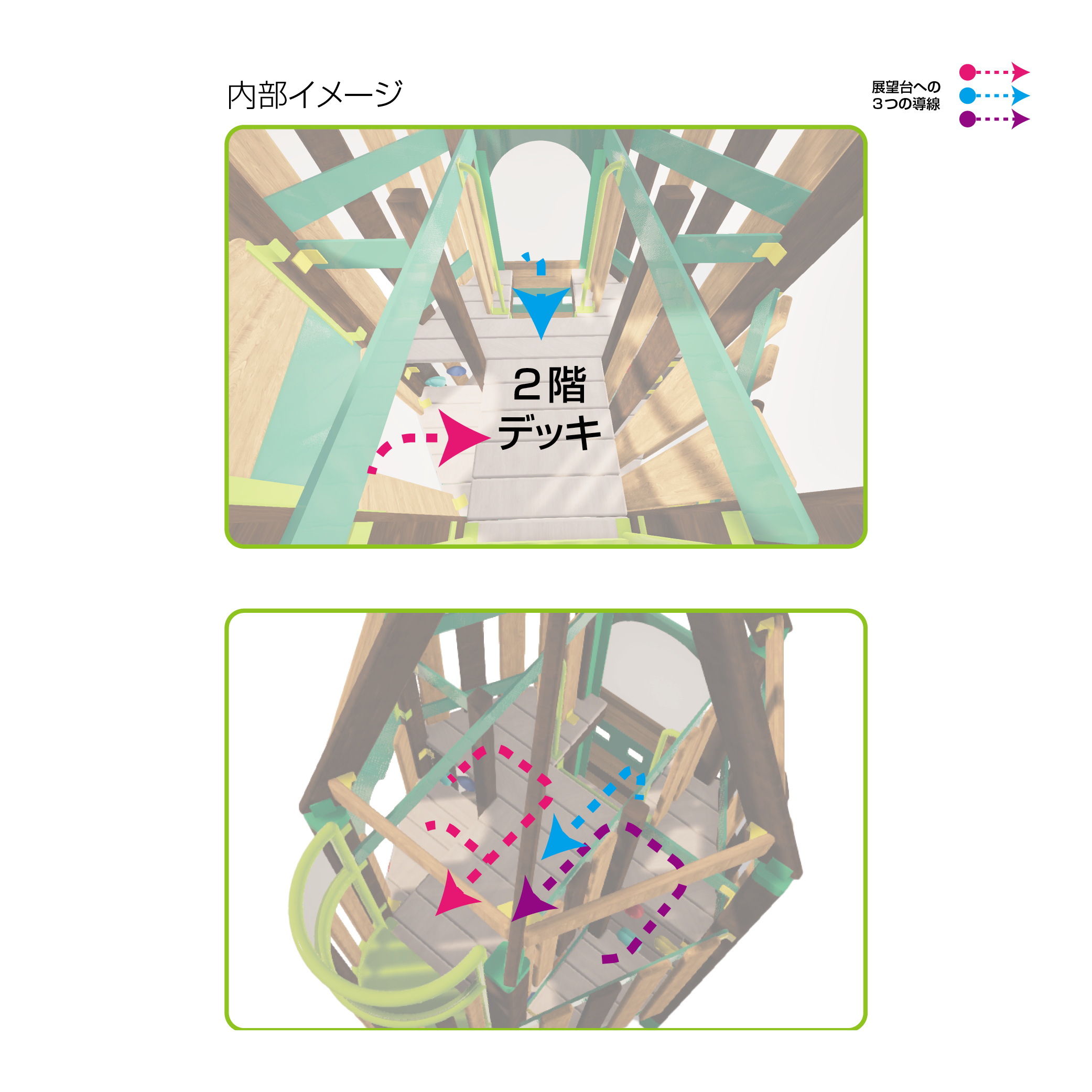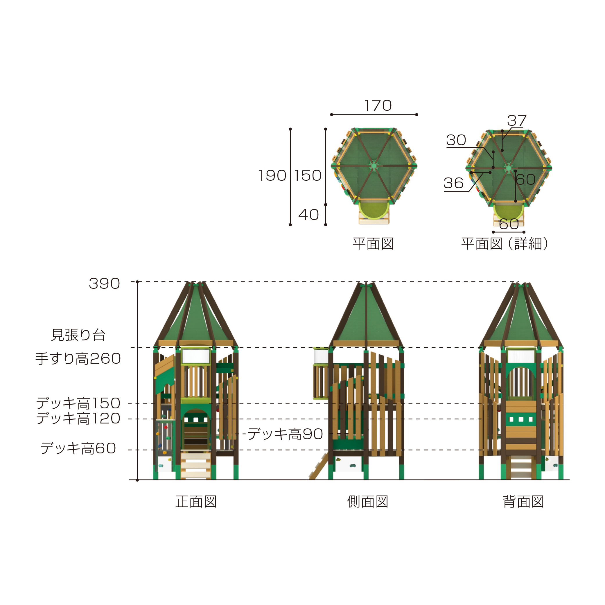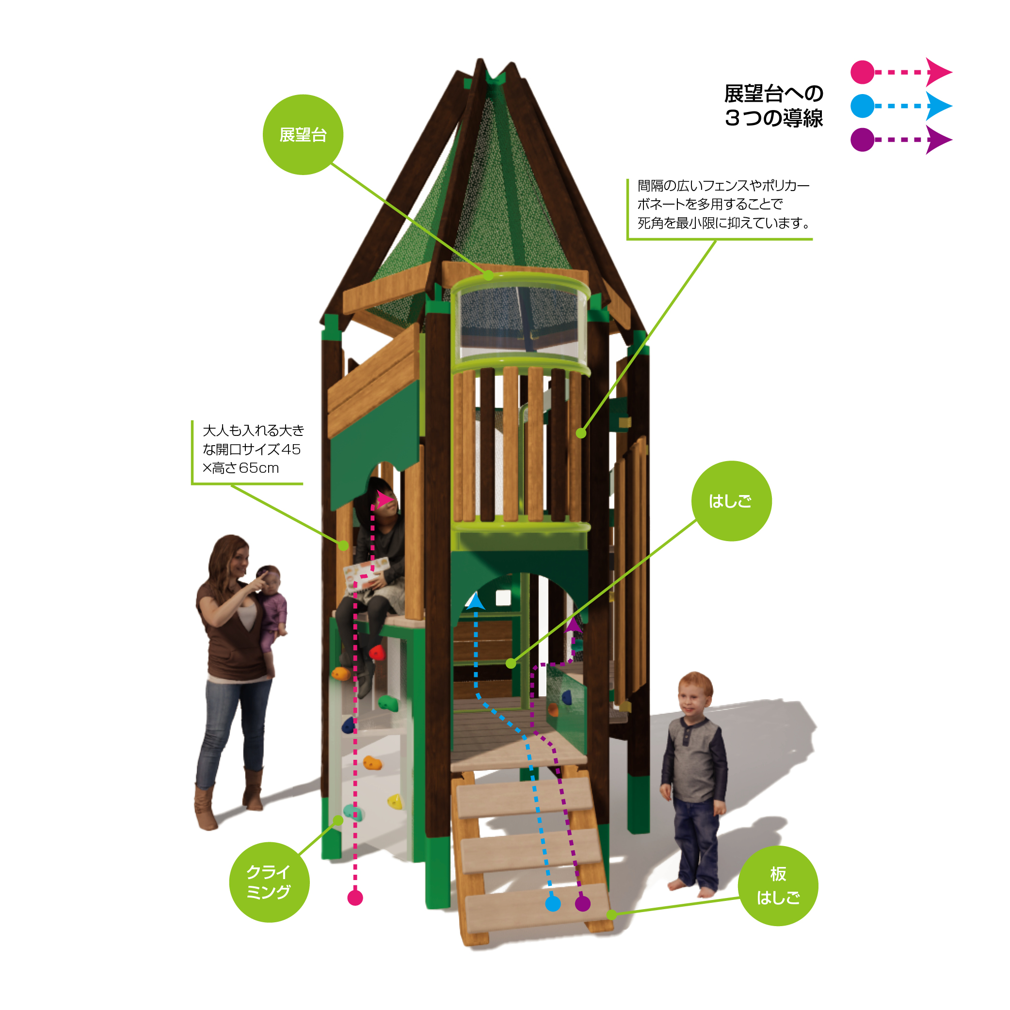 デッキが細かく分かれた少し入り組んだつくりで、省スペースでも子どもたちが遊びごたえを感じられる遊具です。