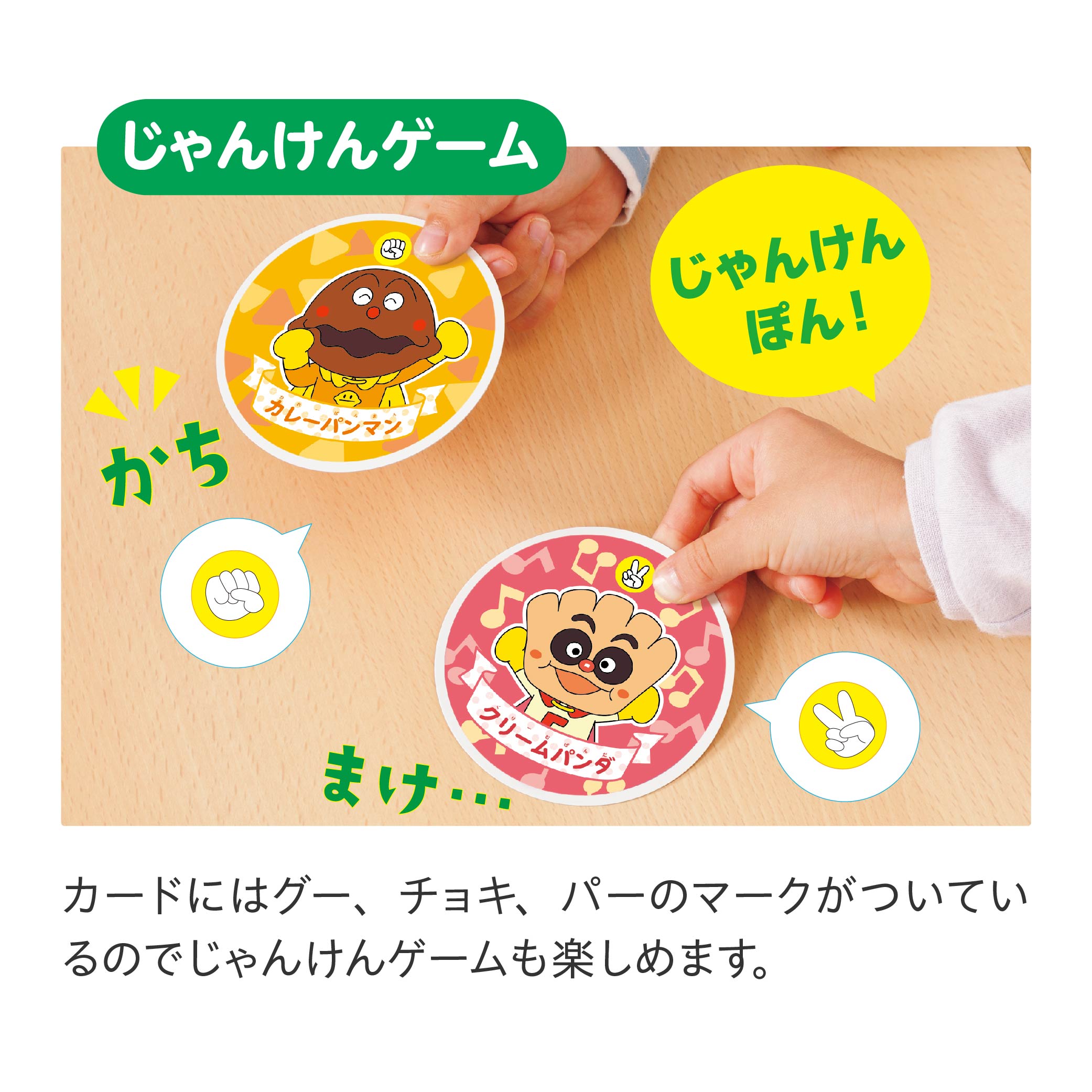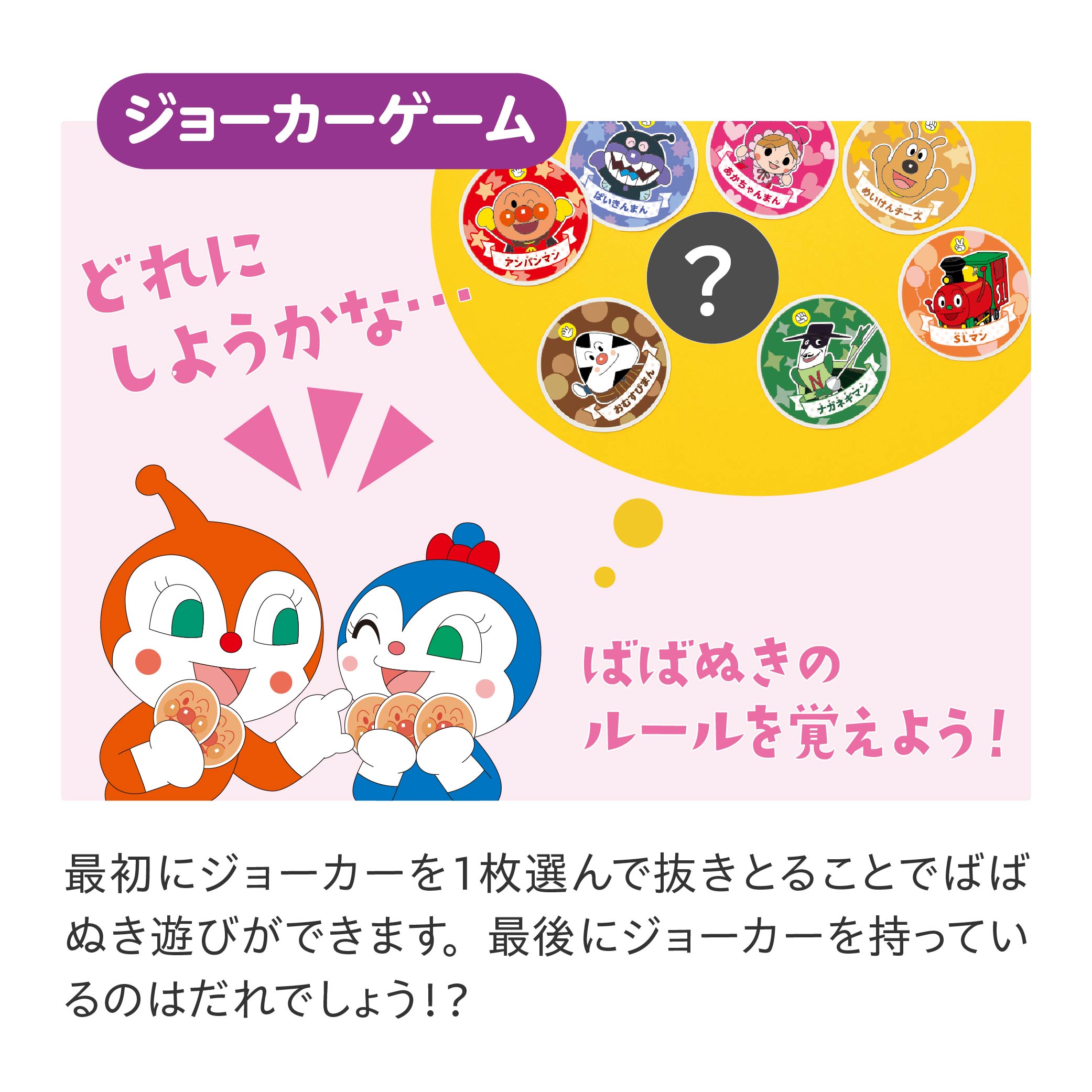 えあわせゲームやじゃんけんゲーム、ジョーカーゲームなどいろいろな遊び方が楽しめます。